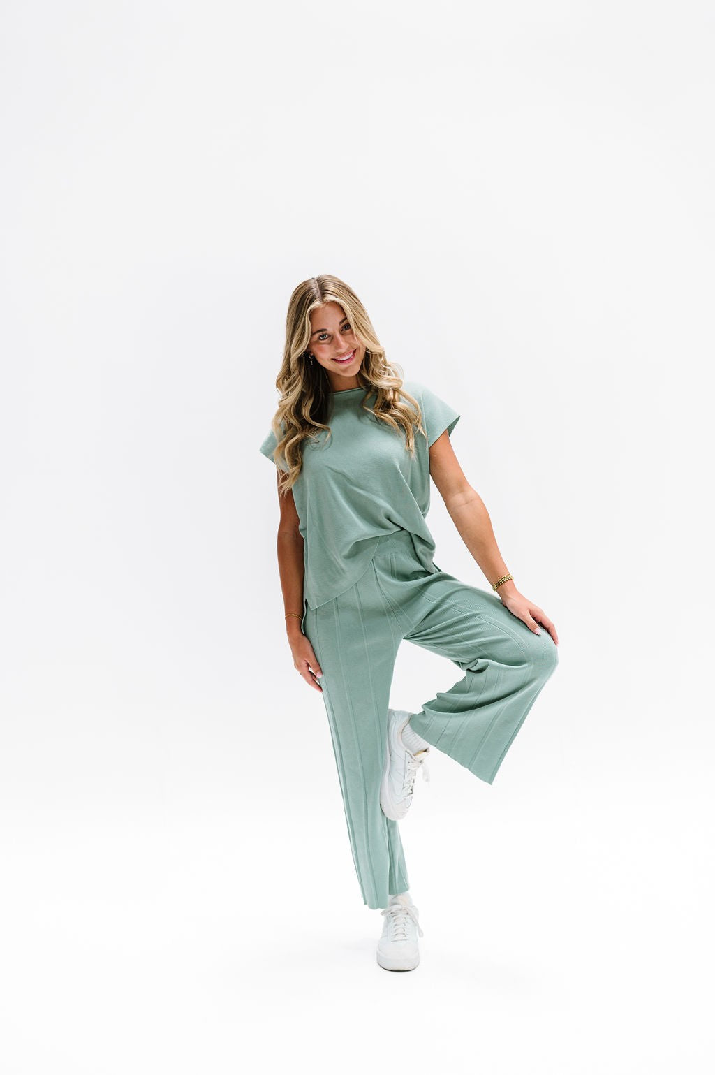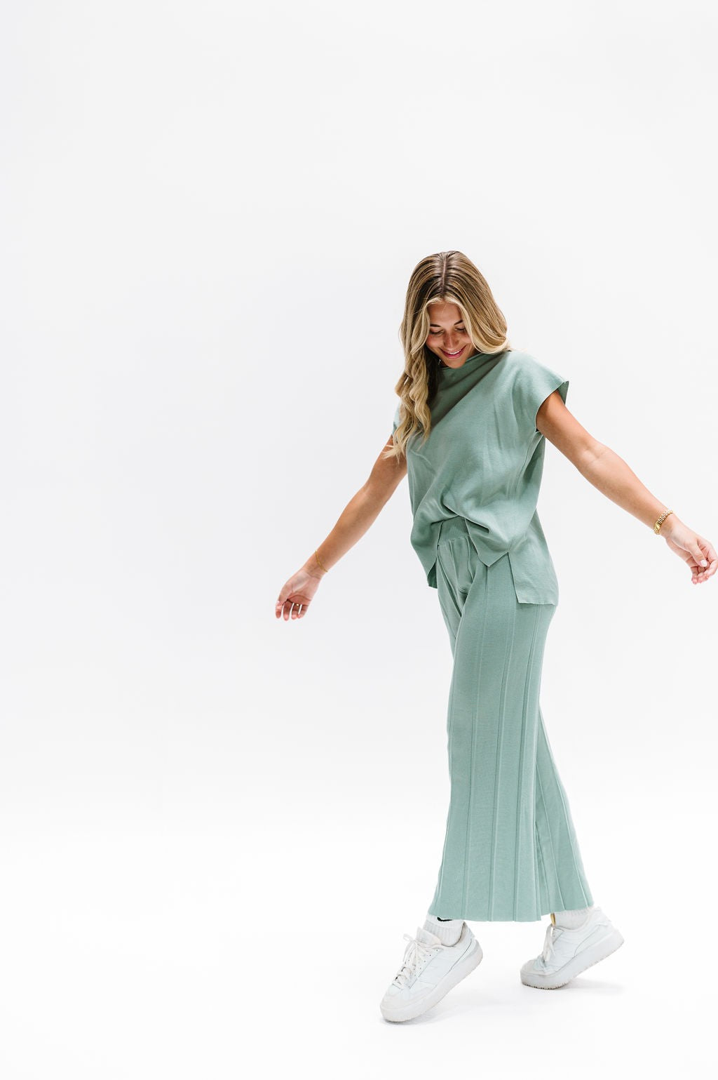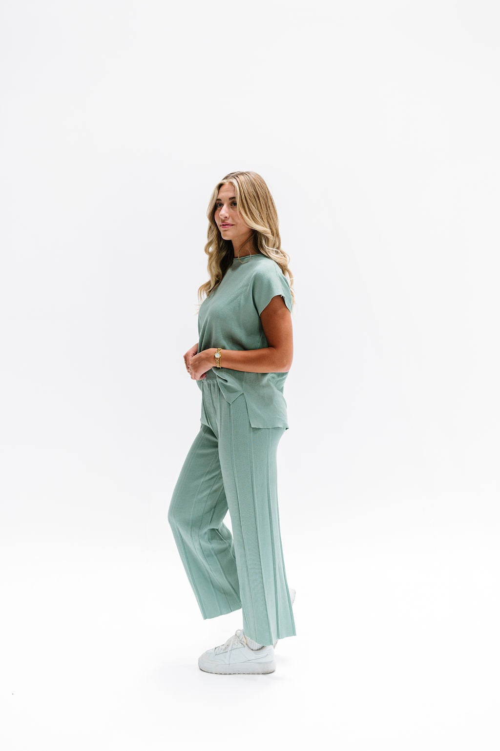 Introducing the ultimate lounge set for all! The Ashalia in Sage by Fehrnvi is the perfect mix of comfort and fashion. Made with lightweight material and pleated pants, this one-size-fits-most set will elevate your loungewear game. Say goodbye to uncomfortable loungewear and hello to the Ashalia Lounge Set!