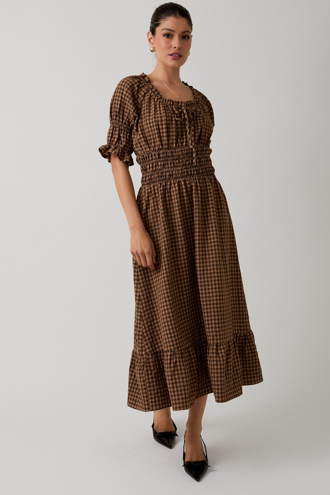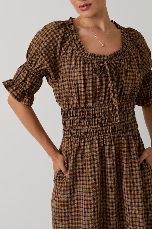 Step into whimsical charm with The Ansel Dress in Taupe + Brown Plaid. Featuring a scoop neck and puff sleeves, this smocked midi dress blends cozy plaid vibes with a playful silhouette, perfect for twirling through your day in effortless style.