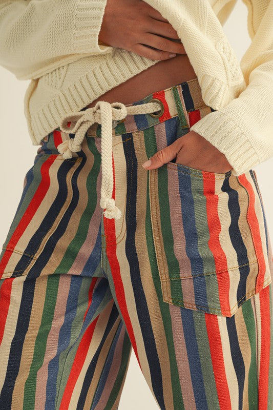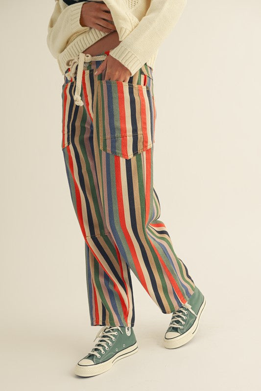 Step into comfort and style with The Cleo Belted Pant in Striped Multi. Featuring relaxed fit washed stripes, a playful rope belt, and clever details like a hidden button-down front, a square pocket upfront, plus a double-layered back pocket for extra flair. Perfect for a laid-back day with a pop of colorful fun!
