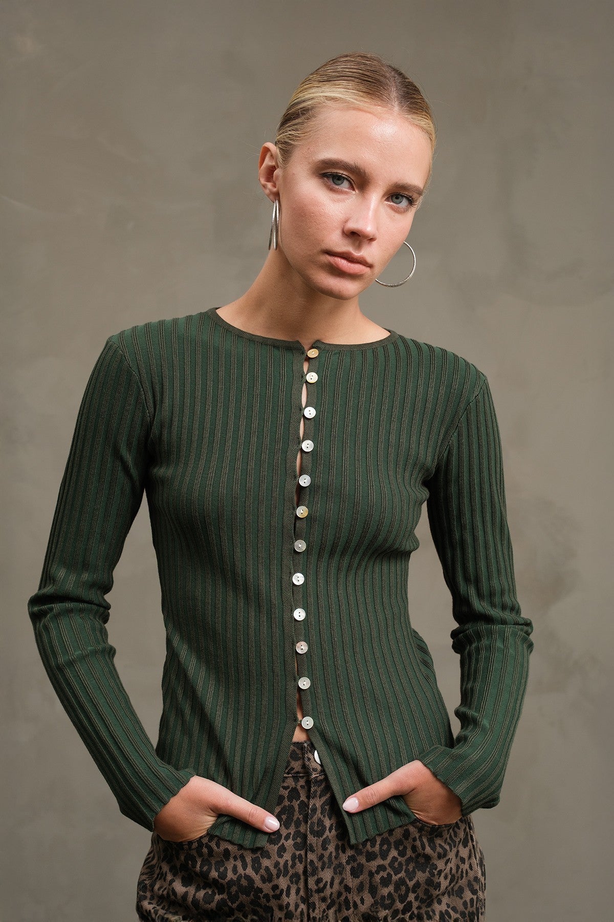 The Daphne Button-Down Top in Moss Green is your new go-to for effortless style. This soft knit cardigan hugs gently to create a sleek, slimming silhouette while the front button closure adds a playful touch. Perfect for layering or wearing on its own, it brings cozy comfort with a flattering fit that’s ready for any adventure.