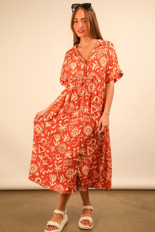 Step into effortless style with the Dennis Patterned Midi Dress in Sunset. This oversized shirt dress features playful button-down details, short folded sleeves, and a flattering V-neck. The shirring adds a touch of charm while the maxi length offers breezy comfort. Perfect for sunny days and casual outings, it’s a fun and easy way to brighten your wardrobe.