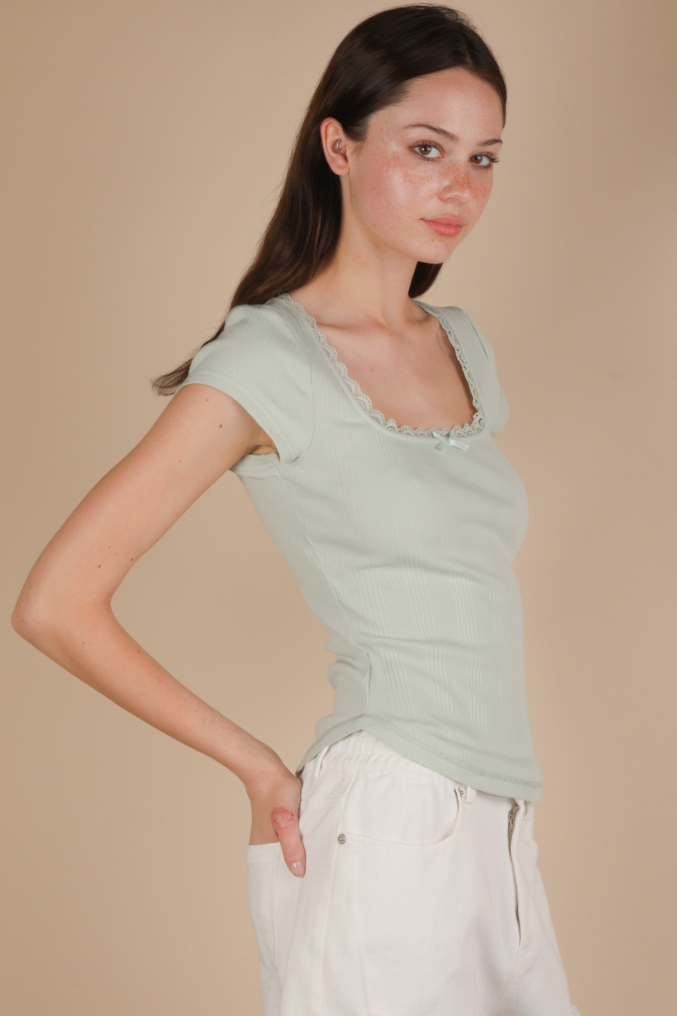 The Gael Ribbed Tee in Sage Green brings a fresh twist to your wardrobe with its playful lace and bow trim details. Featuring a deep round neck and short sleeves, this ribbed knit top offers a comfy fit with a flirty edge. The round hem adds a casual charm, making it perfect for layering or wearing on its own for a fun, effortless look.