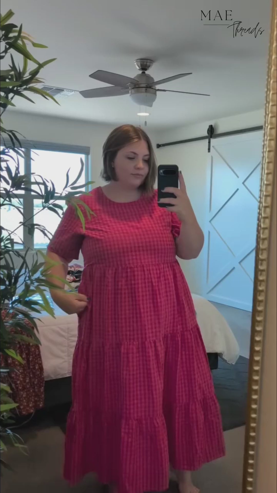 Introducing The Garnet Gingham Tiered Midi Dress in Hot Pink - the perfect blend of quirky and chic! This dress features gingham print, tiered design, and pockets for a fun and functional look. Stand out in hot pink and make a statement everywhere you go.