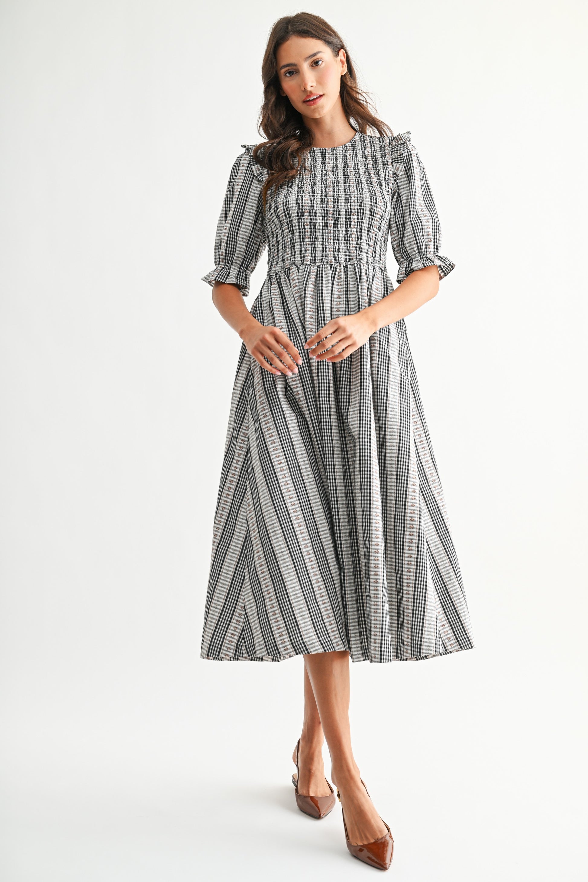 The Kalona Gingham Dress in Black Multi combines a playful black-and-white gingham pattern with a smocked bodice that hugs you just right. Delightful ruffle details on the sleeves add a flirty touch, while the breezy A-line silhouette keeps you cool and comfortable all day long. Perfect for sunny days or casual outings, this dress brings charm and ease to your wardrobe.
