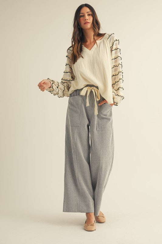 The Linley Ruffle Sleeve Blouse brings effortless charm to your everyday wardrobe. Crafted from breathable cotton gauze, this top features delicate lace detailing on the sleeves paired with solid gauze panels for a playful mix of textures. The ruffled sleeves add a flirty touch that works beautifully for casual outings or dressed-up occasions. Lightweight and comfortable, it's the perfect piece for layering or wearing solo when the weather warms up.