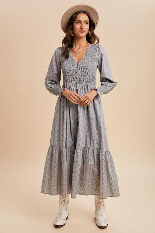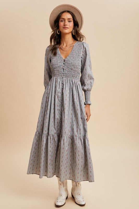 The Liora Button Down Dress in Slate Blue is a playful mix of comfort and charm. Crafted from soft cotton voile, it features a smocked bodice front and back that adds a flattering stretch and fit. Functional cover buttons run down the front for easy wear, while smocked sleeve ends bring a cute, gathered look. With handy side pockets and a full lining, this dress keeps you stylish and comfy all day long. Perfect for twirling through your day with effortless grace!