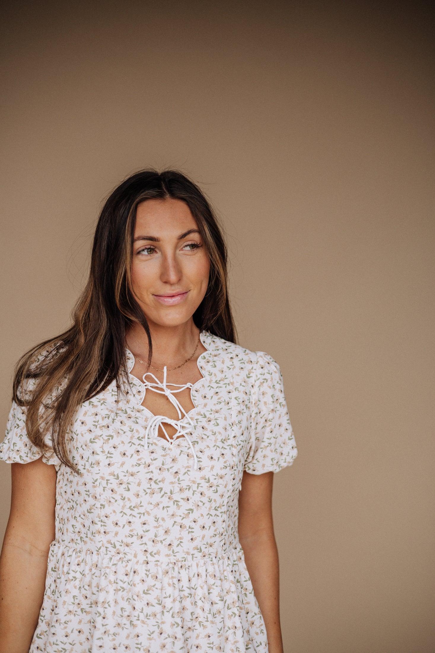 Bring playful charm to your wardrobe with The Sadie Tiered Midi Dress. This whimsical dress features a shoelace necktie and elastic sleeves for a comfortable fit. The layered tiered skirt and scalloped hem add unique design elements that make this dress stand out. Perfect for any occasion, this dress is sure to turn heads.